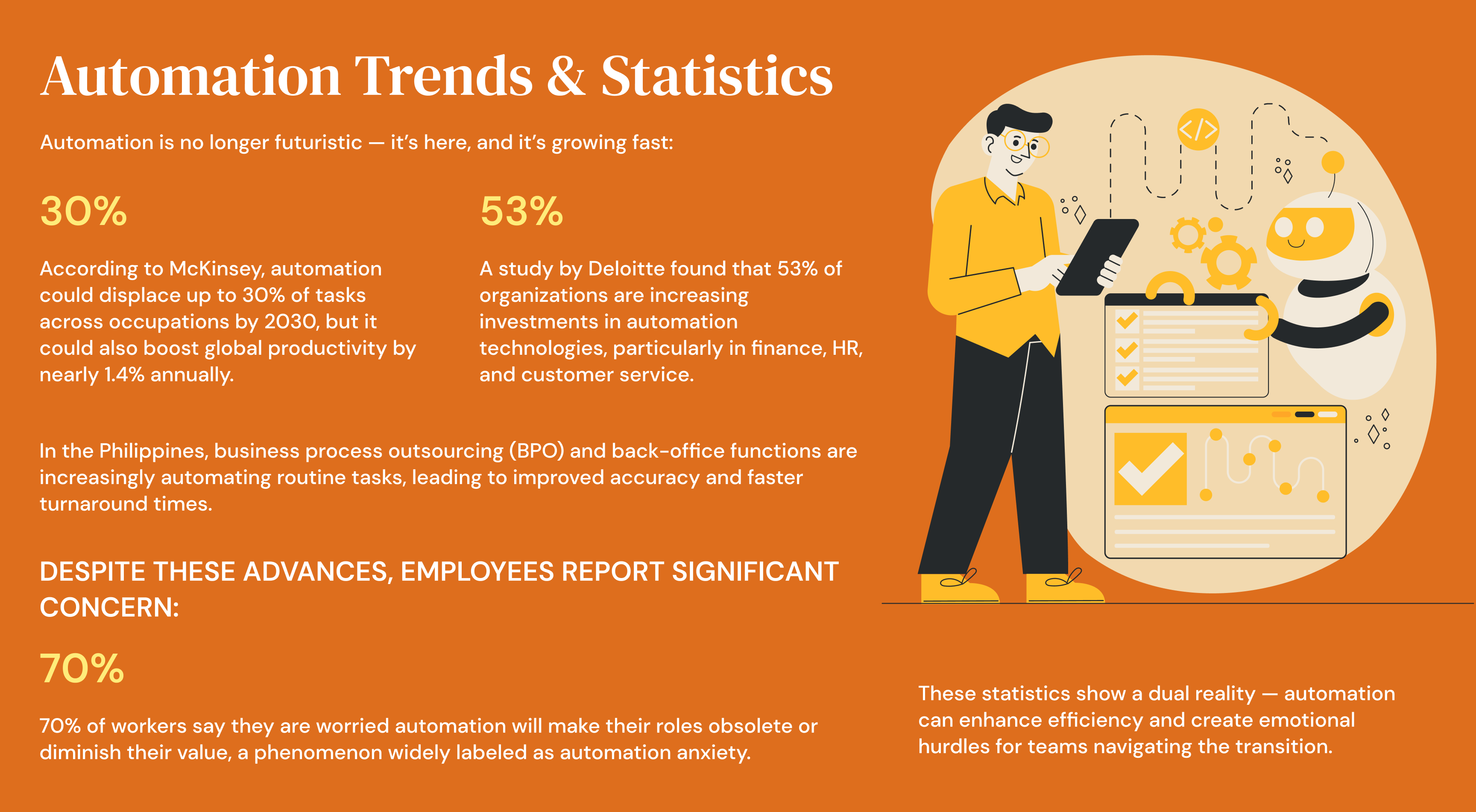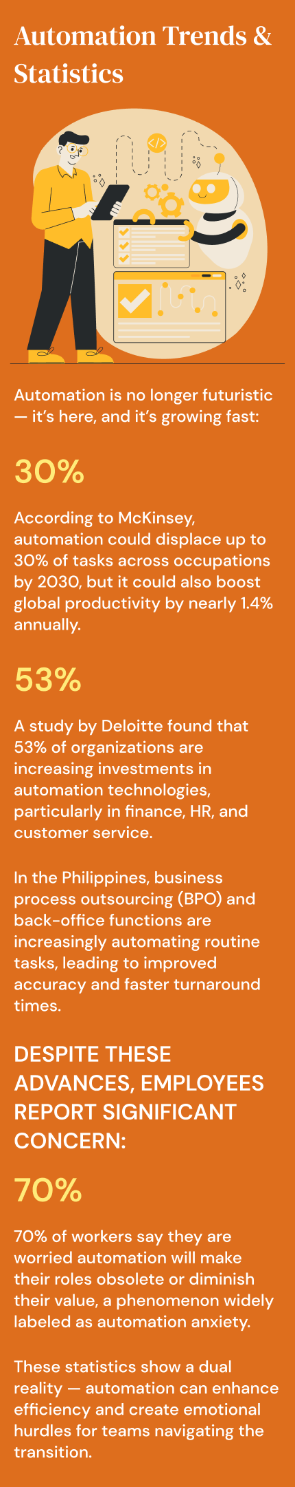 While automation takes over repetitive tasks, human workers can focus on higher-value responsibilities like strategy, analysis, and relationship management.