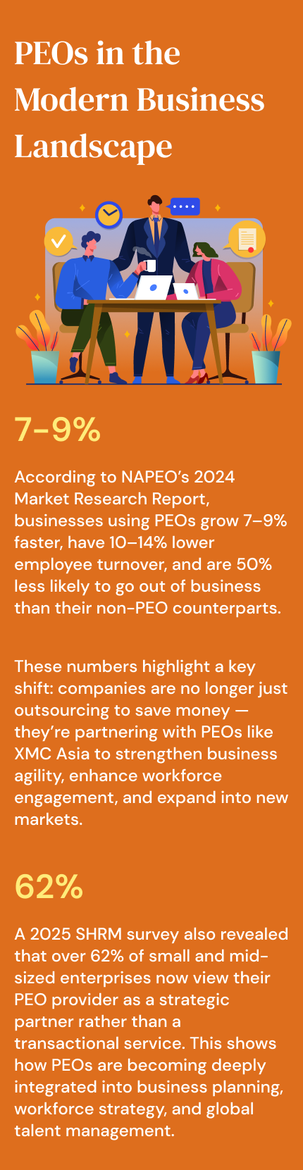 This transformation is especially evident with providers like XMC Asia, a leading PEO solutions partner helping businesses scale efficiently while ensuring compliance and operational excellence across the Asia-Pacific region.