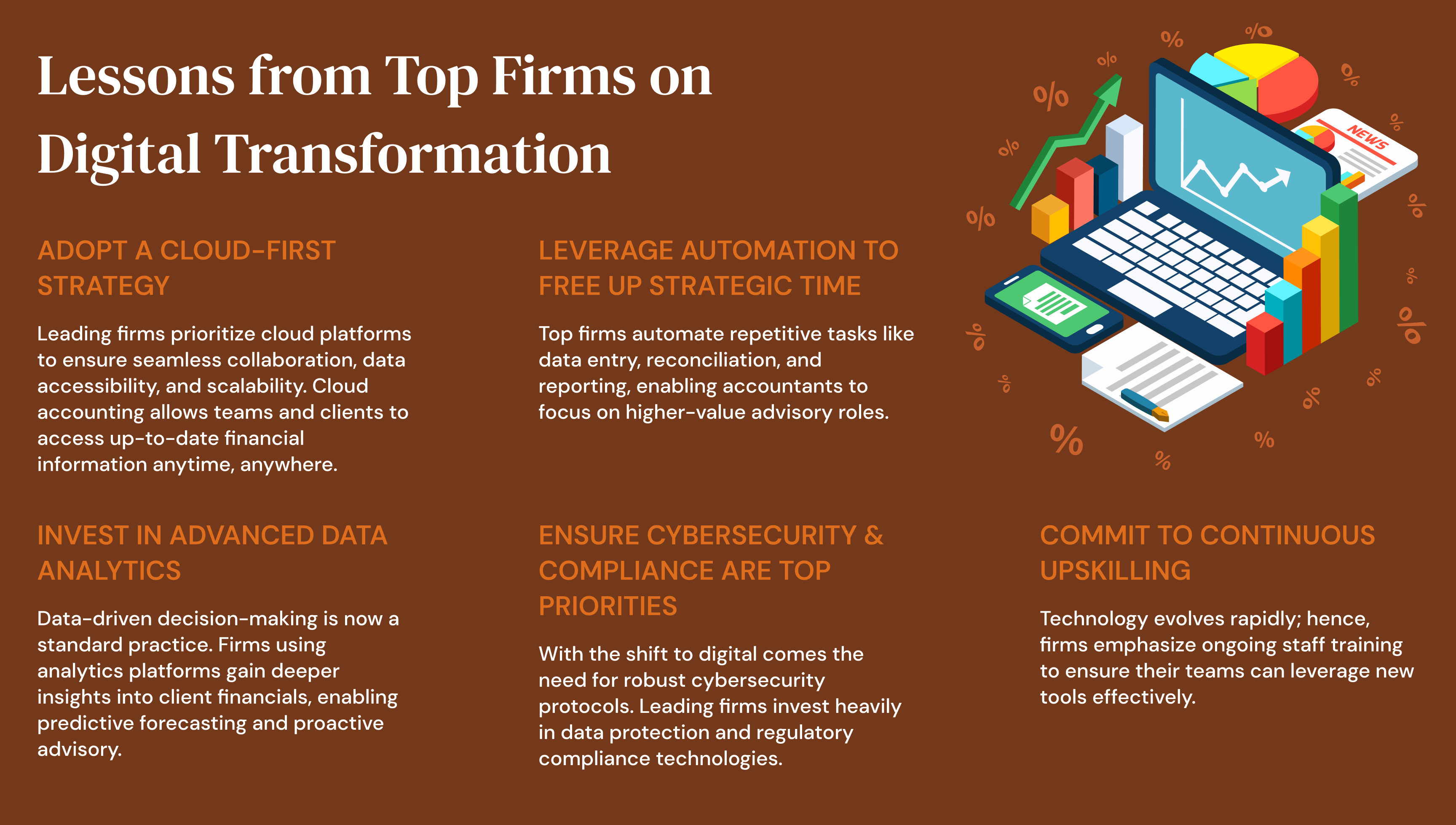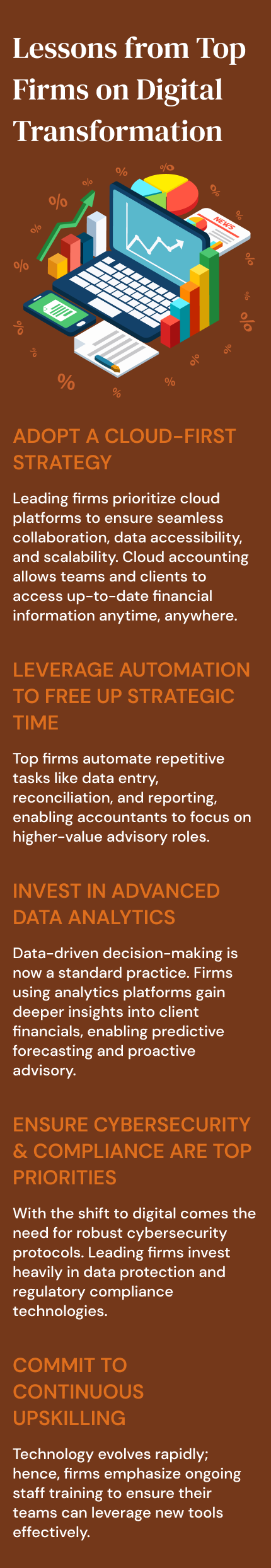 Digital transformation is reshaping the accounting industry, offering firms the opportunity to enhance efficiency, deliver greater value to clients, and stay competitive in a rapidly evolving market. By learning from top firms and leveraging technology strategically, accounting practices can future-proof their operations.