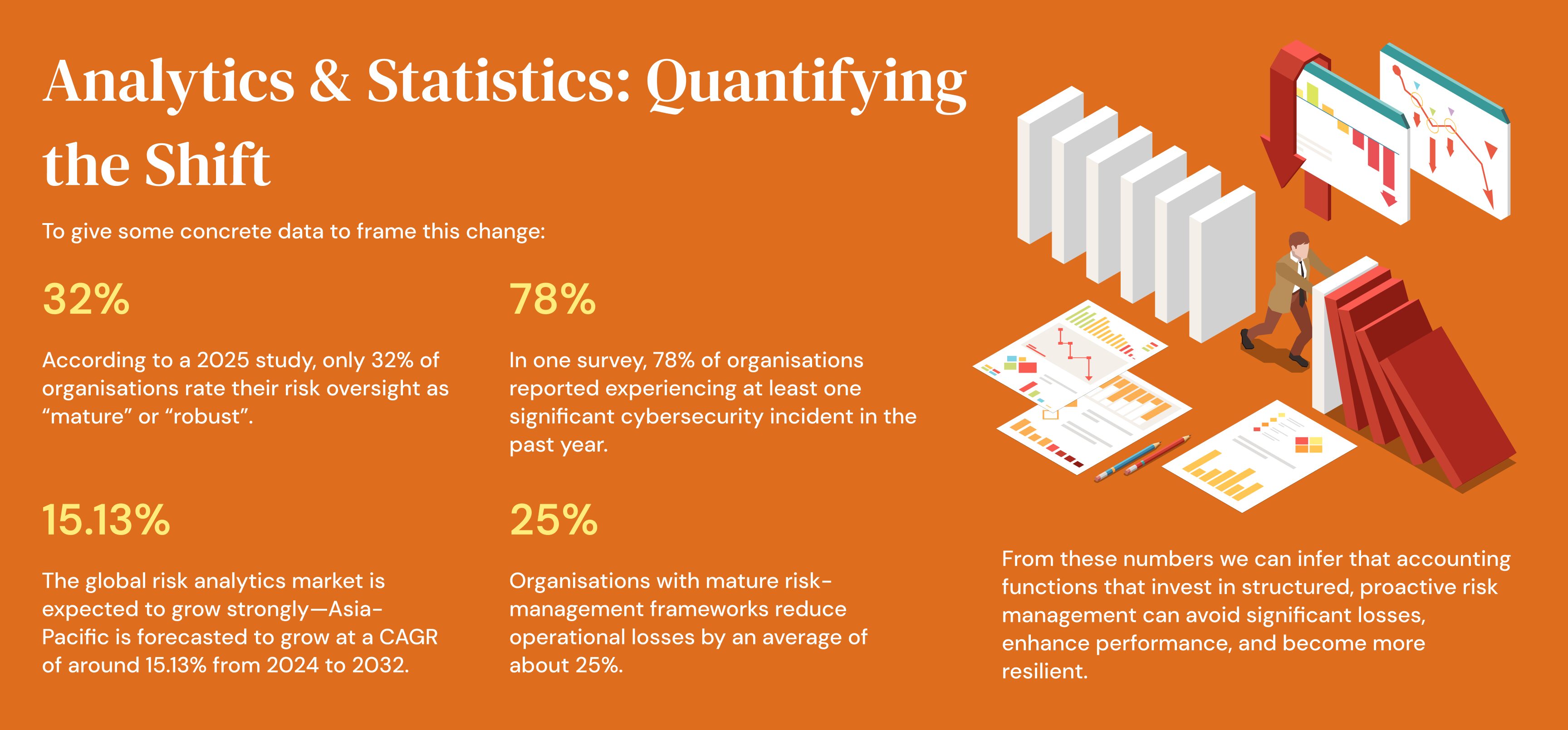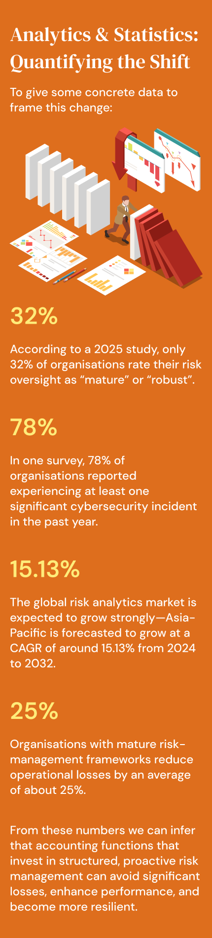 Rather than treating risk solely within the accounting silo (audit, compliance), firms should embed risk into strategic decision-making, business model planning, technology adoption, and operations.