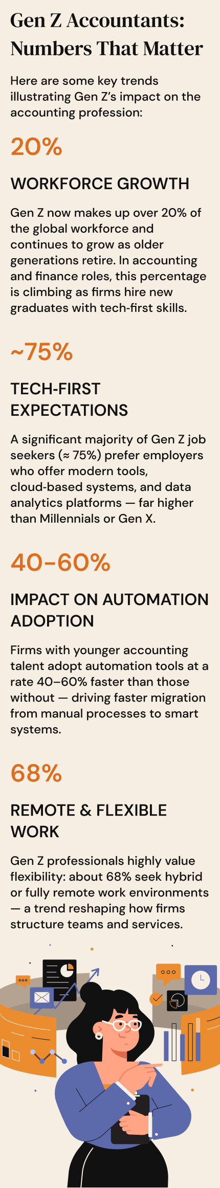 Note: While many of these stats come from industry surveys and workforce trend reports, they reflect real patterns seen across markets where Gen Z enters accounting roles in increasing numbers.